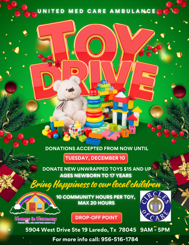 United Med Care Ambulance is thrilled to announce our annual Christmas Toy Drive to bring joy to local foster children from Homes in Harmony and Circles of Care. This holiday season let’s come together to spread cheer and make a difference in the lives of these deserving children.